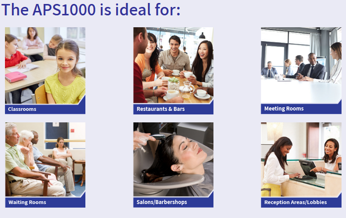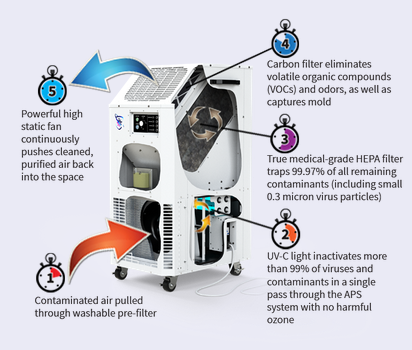 - In just five minutes, the APS1000 deactivates 99.5% of airborne pathogens in a 500 sq. ft. area with 8-ft. ceiling.