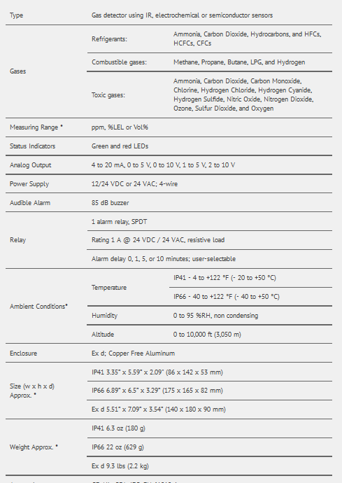 The MGS-150 Gas Detector can meet almost any gas detection need with multiple sensor options for real-time monitoring of refrigerants, oxygen, combustible and toxic gases. It includes user-selectable current or volt analog outputs, allowing connectivity to most BMS, SCADA or central control systems. Status LEDs and a buzzer are integrated for local alarming while an onboard relay with user-adjustable set-point can connect to external visual/audible alarms. A variety of enclosure options, including an economical IP41 housing and a dust/water tight IP66 housing, allow the MGS-150 transmitters to be placed in the toughest environments. Special remote sensor configurations are available for applications where mounting in vent pipes, duct work or other tight spaces is required.