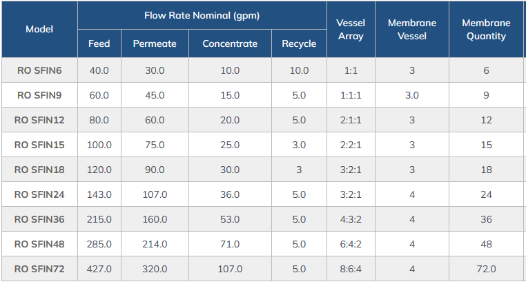 Sureflo (SFIN Series) Commercial Reverse Osmosis Systems provide between 30 GPM (43,200 GPD) to 320 GPM (460,800 GPD) designed for 75% standard recovery.