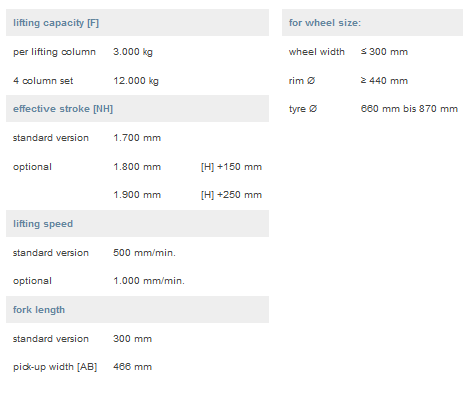- lifting capacity: 3.000 kg each lifting column standard version:4 column set with 12.000 kg lifting capacity (other column sets on request)