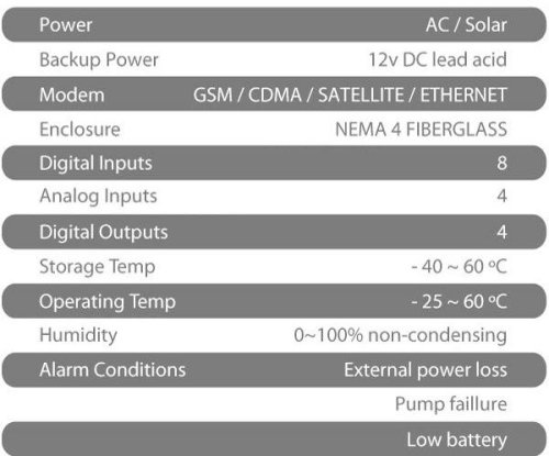 Thanks to its 8 digital inputs, 4 analog inputs and 8 digital outputs the HTT-2100 can turn on/off remote pump stations based upon remote tank readings or by a simple input by an operator using the TelemetryVIEW web interface. Automatic or manual is always an option for the operator and can be changed at any time.