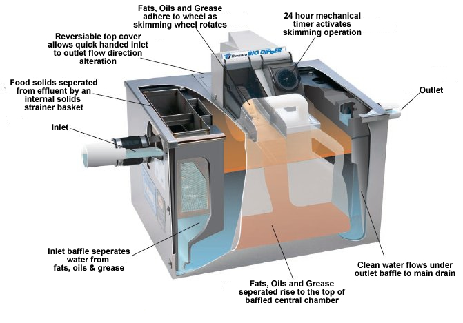 The Big Dipper® point of source system is an automatic, self-cleaning device. As greasy kitchen effluent drains from commercial kitchen fixtures, the unit traps the fat, oils and grease with the central retention tank. Incidental solids in the kitchen flow are trapped in a strainer basket for disposal. The fats, oils & grease separate from effluent and rise to the surface of the stainless steel tank. The unit automatically skims the trapped grease at least once per day and transfers the waste in to a collection container. A timer controls the self cleaning operation, activating the skimming wheel at the proper time. ‘Cleaned’ water exits the unit and flows into the establishments drain lines. The Big Dipper point of source units efficiently service single fixtures such as 1 to 3 compartment sinks, pre-rinse stations, combination ovens or wok stations.