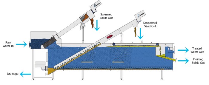 Compact wastewater pre-treatment unit that integrates a TTC and a DA in a single unit, thus carrying out several processes: roughing, desanding and degreasing. Highly efficient equipment for wastewater pre-treatment.