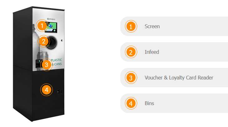 Envipco’s RVM model for return centres with minimal available space and low volume drinks package recycling such as convenience stores, pharmacies, petrol stations, and schools.