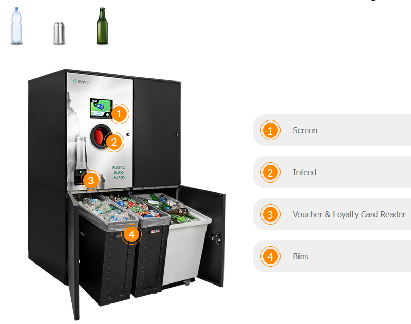 Envipco’s RVM model for return centres with minimal available space and low volume drinks package recycling such as convenience stores, pharmacies, petrol stations, and schools.