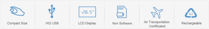 Super compact size designed for cold chain; connect with PC via the integrated USB port directly. Auto PDF report once connected with PC without software operation. HD LCD shift displays the real-time T & RH data, history max & min value and over-limit alarm. Suitable for cold chain transportation with the Certification of Safe Air Transport. Super low power consumption, reusable application, huge memory capacity.