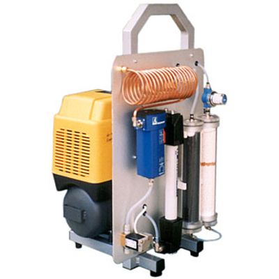 Compact zero gas system with permeation dryer and 6 l pressurizing gas tank for process and zero gas used in the gas analysis industry. Compressor requires no oil. Immediate functional, maintenance-free operation.