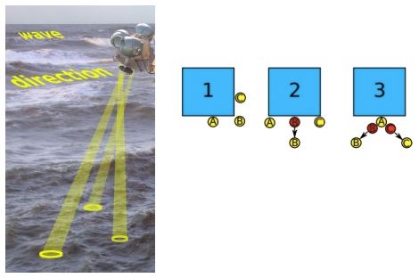 With an array of three radars the elevations of the sea surface is measured at three positions. Knowing the slopes and the phase relations, the directional spectrum can be accurately calculated. The directional system consists of three downward-pointing radars. They form a virtual triangle at the water surface. The standard set-up in the one-point frame is one sensor pointing perpendicularly downwards and two tilted under an angle of 15 degrees. See visualisation below.
