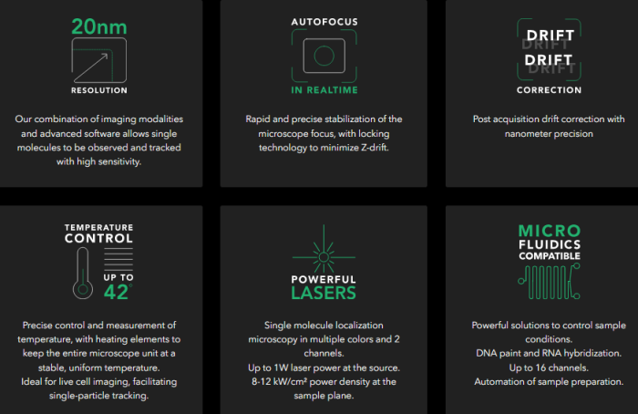 20nm Resolution: Our combination of imaging modalities and advanced software allows single molecules to be observed and tracked with high sensitivity. Autofocus in Realtime: Rapid and precise stabilization of the microscope focus, with locking technology to minimize Z-drift. Correction: Post acquisition drift correction with nanometer precision Temperature control: Precise control and measurement of temperature, with heating elements to keep the entire microscope unit at a stable, uniform temperature. Ideal for live cell imaging, facilitating single-particle tracking. Powerful lasers: Single molecule localization microscopy in multiple colors and 2 channels. Up to 1W laser power at the source. 8-12 kW/cm² power density at the sample plane. Micro fluidics compatible: Powerful solutions to control sample conditions. DNA paint and RNA hybridization. Up to 16 channels. Automation of sample preparation.