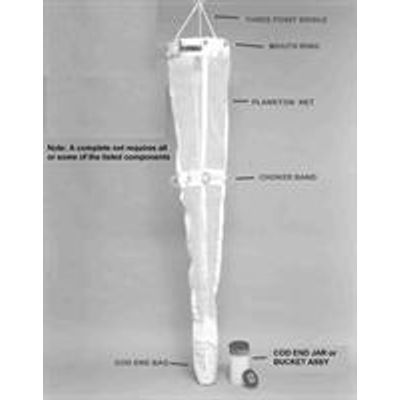 A complete plankton net assembly consists of the net, mouth ring, cod end assembly and three-point bridle, and may also include a flowmeter and choker band. Start by selecting the net by mesh opening, then select between a cod end jar or bucket. Add on a flow meter and choker band if desired.