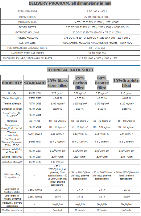 Improved hardness over virgin PTFE. Excellent wear resistance over virgin PTFE. High compressive strength. Excellent oilfree sliding material with low friction. Excellent oilfree bushing & piston ring material. Some gradesbiosafe and inert. Reduced creep.