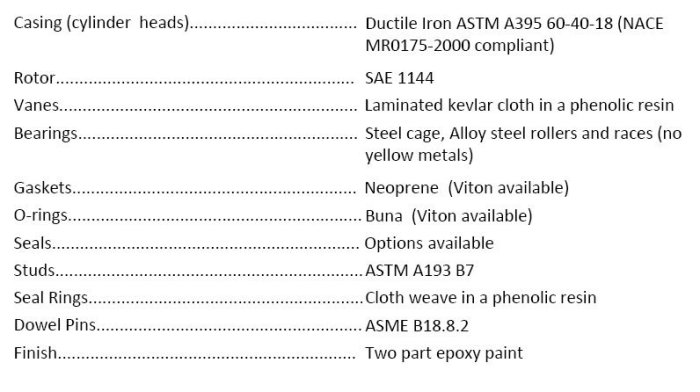 Inlet Connection 2` ANSI Class 150 Flat Face Flange.Outlet Connection 1.5` ANSI Class 150 Flat Face Flange.Operating Speed Range 865 rpm through 2200 rpm.Maximum Allowable Working Pressure 80 psig (5.5 barg).Maximum Allowable Operating Temp 350°F (176°C).Shaft Seal Single face mechanical or double bellows.Bearings Steel cage, Alloy steel rollers and races (no yellow metals).Lubrication Once through oil injection system - 5 points (by others).Drive Type Direct couple or belt driven, suitable for VFD.Shaft End 1.25` diameter at coupling