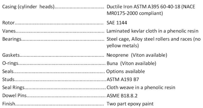 Inlet Connection 2` ANSI Class 150 Flat Face Flange.Outlet Connection 1.5` ANSI Class 150 Flat Face Flange.Operating Speed Range 865 rpm through 2200 rpm.Maximum Allowable Working Pressure 80 psig (5.5 barg).Maximum Allowable Operating Temp 350°F (176°C).Shaft Seal Single face mechanical or double bellows.Bearings Steel cage, Alloy steel rollers and races (no yellow metals).Lubrication Once through oil injection system - 5 points (by others).Drive Type Direct couple or belt driven, suitable for VFD.Shaft End 1.25` diameter at coupling