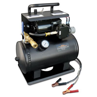 The 12 Volt Compressor is lightweight and compact, ideal for field use. It uses any 12 Volt DC power source, such as a car or truck vehicle battery. The compressor operates at 125 psi with a 2 US gallon (7.6 liter) air tank rated to 150 psi.