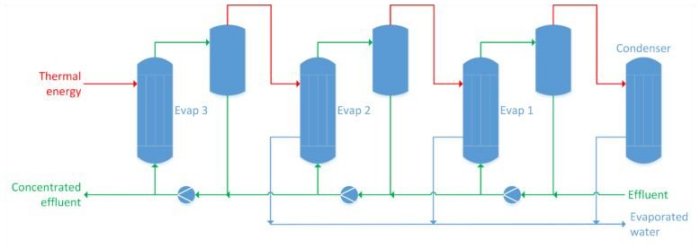 These systems combine various evaporation stages. The vapour obtained from a previous stage is used as the thermal energy source for the resulting stage. Multiple stages can be combined to reduce the energy consumption needed for the amount of water evaporated.