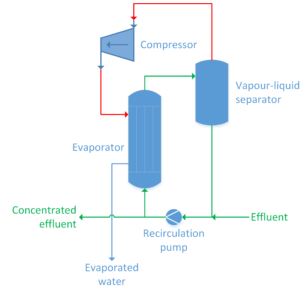 In MVR setup, the evaporated steam is sent to a compressor (where it increases in pressure and temperature) and used as the thermal energy source in the evaporation process. Only electrical energy (for driving the compressor) is used in this setup. In TVR setup, boiler steam can be mixed with evaporated steam in a thermo-compressor, leading to considerable energy savings.