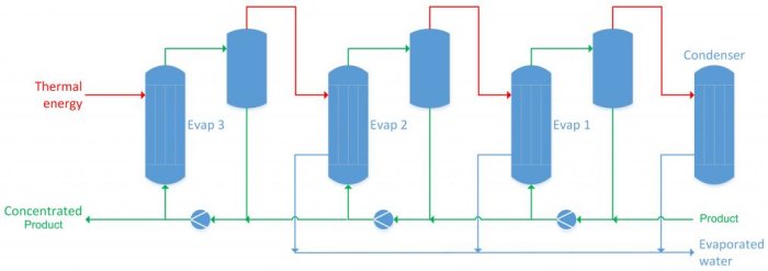 These systems combine various evaporation stages. The vapor obtained from a previous stage is used as the thermal energy source for the resulting stage. Multiple stages can be combined to reduce the energy consumption needed for the amount of water evaporated.