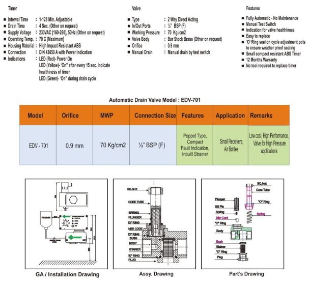 Model EDV-701 is Designed to Remove Condensate from Compressed-Air Systems. Most Suitable for Installation. Drip legs. Moisture Separators etc. Valve has facility to drain manually on power failure.