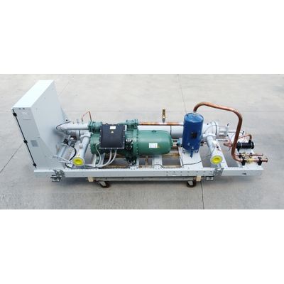 Hitema condenserless chiller Model CWB1.350 has been designed to be installed where there is a lack of space. It is equipped with one refrigerant circuit, with one shell and tube evaporator, one screw compressor and one oil separator. The compressors shut off valves are extremely helpful in case of maintenance must be performed, while the spring antivibrating mounts allow to reduce the vibrations caused by components on the chillers, preventing refrigerant piping damages. Furthermore the electrical components are design for high temperatures and the high pressure prevention system reduce the load in case the condensing pressure raise too much. This extend the chiller operation envelope.