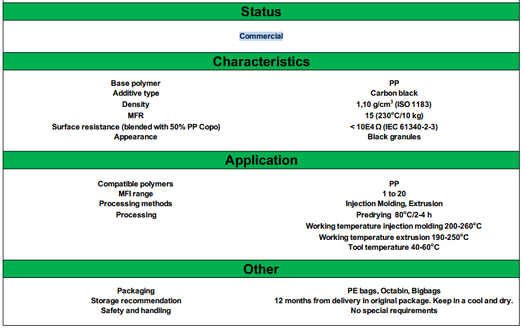 Application examples: Electrical conductive PP products made by. Injection molding or extrusion In general. High concentrated carbon black masterbatch for blending.