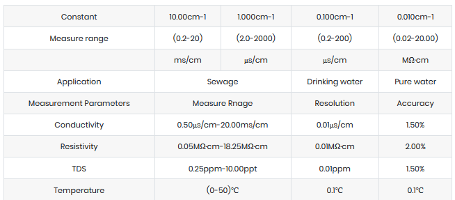 • Range: 0.01 electrode: 0.02~20.00us/cm