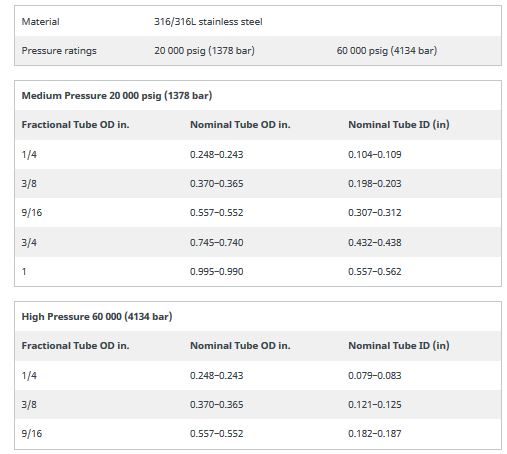 Swagelok offers cold-drawn 316 stainless steel, nominal OD, medium-pressure tubing with working pressures up to 20 000 psig (1378 bar) for use with medium-pressure fittings, as well as high-pressure tubing rated up to 60 000 psig (4134 bar) for use with high-pressure fittings.