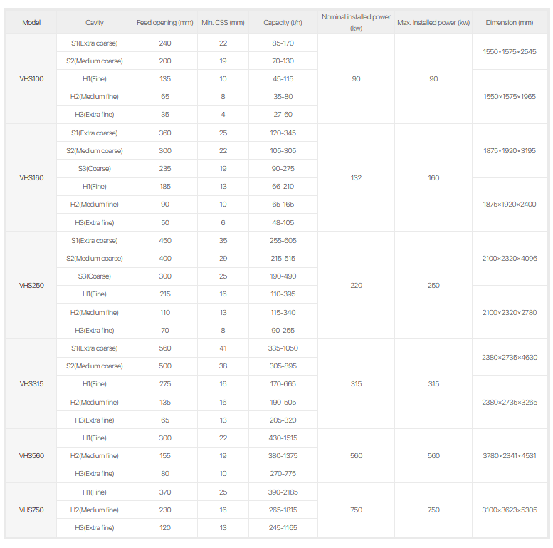 The VHS Cone Crusher can be widely used in medium, fine and ultrafine crushing operations in metal and non-metallic ore, cement, aggregates, metallurgy and other industries. Its advantages are: high crushing efficiency, low production costs, easy maintenance and adjustment as well as excellent product shape.