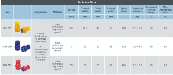 We offer water distribution nozzles for cooling towers, humidifiers, scrubbers, air coolers and aerators. These nozzles are made of glass fiber reinforced polyamide (nylon) and are resistant to a large range of chemicals. Their smooth surface impedes clogging and scaling. The spray angel of 120° provides an optimum water distribution above the cooling tower packing.