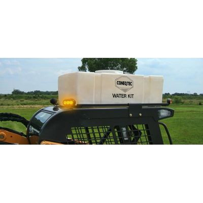 There are two sizes available: 25 gallon and 55 gallon. The tank simply straps onto the roof of the skid-steer. Constant flow of water delivery to the sprayer arm is provided by the option of either a pump or gravity flow.