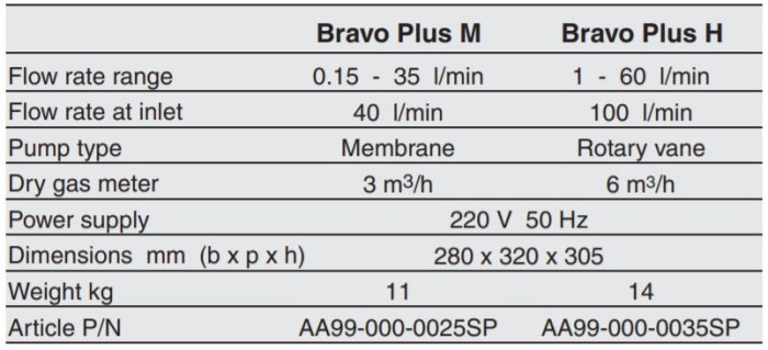 The Bravo Plus is available with two different pump types, a “rotary vane”, and a “membrane” pump.