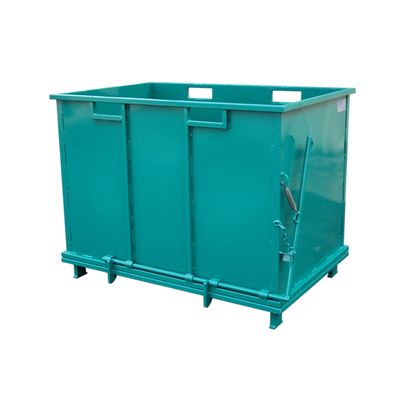 The container with openable bottom is designed to be placed inside the factory. This product can be used in several factory plants, for example machine shops, joiner shops, paper mills,... This is a good solution for collecting and recycling waste materials. The bottom of the container is not hermetic so it can not be used where liquids waste and/or solid waste soaked in liquids are produced. The container can be equipped with upper openings or special hooks suitable to move and lift the container with a forklift truck. The operator has to use a forklift truck to remove the material inside the container. The operator lift the container over the collecting container and then can easily open the bottom simply pulling the opening lever with a rope remaining in the driving seat.