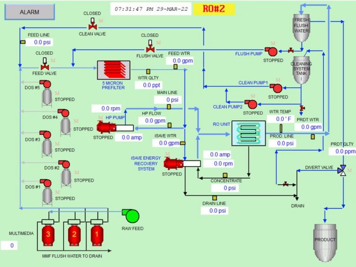 The Permeate Water Flush function purges the salt water out of the system by pumping permeate water into the membrane housing before each shut down and before ever)* startup. By having permeate water during the shut down period, high salinity water would not permeate into the product water side. This maintains product water quality and extends the membrane life time.