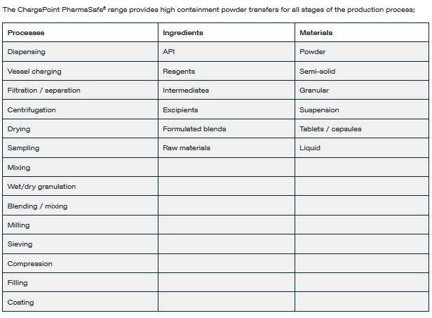 ChargePoint Technology’s PharmaSafe transfer valve range offers the highest levels of operator protection through validated containment performance. High containment powder transfer valves provide safe handling of non-sterile API and formulation ingredients with nanogram levels of containment performance.