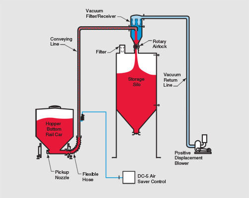 The material is fed into the conveying line on a continuous basis by vacuum. DC-5 Air Saver technology is used to minimize and optimize the low pressure supply air which is supplied by a low pressure positive displacement blower. The system includes a vacuum pickup nozzle, a vacuum filter receiver, a rotary airlock feeder and a positive displacement blower.