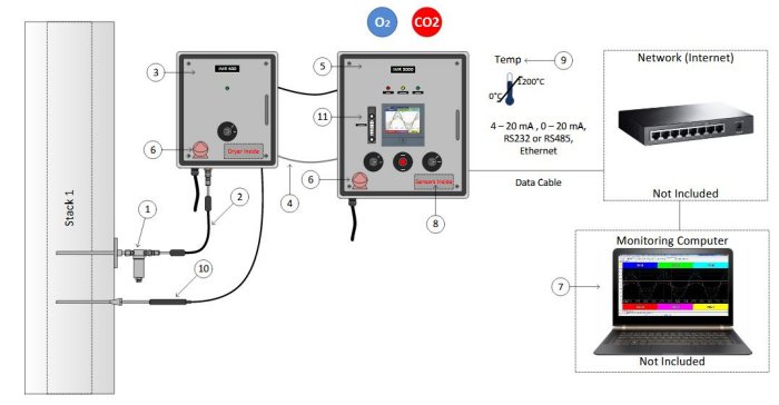 The Internal gas conditioning unit (Peltier cooler or permeation dryer) dries and conditions the gas. The conditioned flue-gas is then analyzed by the individual sensors (NDIR or Electrochemical). Processing unit inside the IMR 5000 process this information and display it on its 5.7inch screen and relays the information to a monitoring computer provide by customer. Thanks to the software application installed in the monitorine unit, the customer is able to monitor this data.