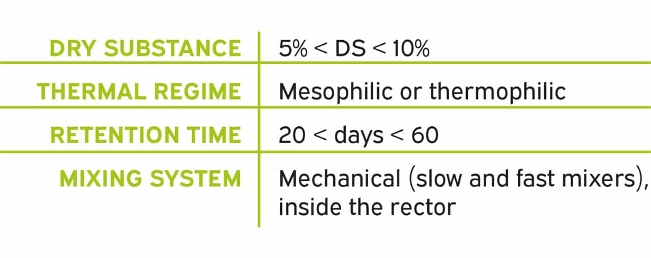 The CSTR (Continuous-Flow Stirred Tank Reactor) is a technological solution that requires a continuous flow of fresh biomass. The biomass fed into the reactor is constantly mixed to ensure a perfect homogenization. In the CSTR, the anaerobic digestion process takes place at controlled temperatures and for dry matter contents below 10 percent. The retention time is variable and depends on the types of biomasses used to feed the plant.