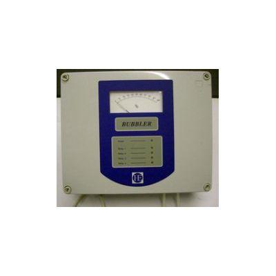 The system is designed for use in aggressive liquids which would attack an immersed pressure transducer/ transmitter, air is bubbled into the liquid via a dip tube with a balance chamber to smooth out pressure pulses. The output pressure from the balance chamber is fed by a nylon tube to the transducer, situated in the controller. The transducers output signal is conditioned to provide a 4-20mA signal proportional to the depth and also to provide an integral meter reading. Control is provided by 4 trip amplifiers each providing a volt free contact output. The unit illustrated is available in either 0-1 m or 0-3m ranges. Alternatively larger units can be supplied for ranges up to 30m complete with ancillary pneumatic gear (details on receipt of application specification). The control unit is normally supplied complete with wall mounting plastic enclosure to IP54.