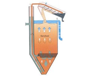 The incoming water is channelled to a longitudinal inlet shaft, injected into and spread evenly through the bed, solid impurities are filtered off from the water and will remain in the sand. The filtered water is led away from the surface by means of V-notch openings along the entire length of filter. The polluted sand is transported continuously using an airlift from the bottom of the filter to an open sand washer placed above the filter.