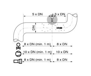 In case of pipe diameters over 200 mm, 2 or 3 sensors per measuring point are used, with the sensors arranged at 90° or 120° to each other.