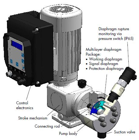 By using the multi-layer diaphragm these pumps can now handle dosing tasks with higher requirements regarding safety. Such demands will be fulfilled by the higher lifetime of the multi-layer diaphragm in comparison to single layer diaphragms and thanks to the integrated diaphragm rupture signalization (manometer as standard plus optional pressure switch).