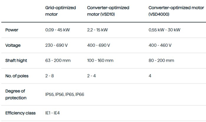 The Innomotics GP VSD motors are based on the platform of the Innomotics GP motor series. The design corresponds to the line motors – the mechanical parts are identical. The motors are adapted to the converter by appropriately dimensioning the active part and VSD-specific rating plate data. In addition, a large number of the variations available for the line motors (types of construction, motor protection, terminal box position, and options) are also available for the VSD motors.