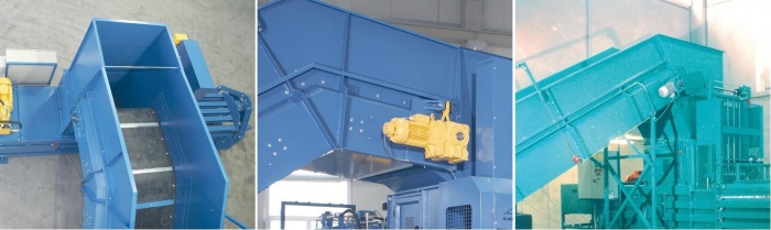 Chain belt conveyors in heavy-duty designs. Charging of baling presses, shredders etc., suitable for paper, cardboard, foils, etc., clear widths of 800 – 1600 mm, gear drives of 2.2 – 11 kw.