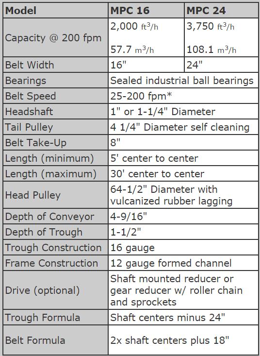 You`ll find a host of solutions in the MP Series! Typical applications include unloading hopper cars, tanks or trailers, feeding bins and tanks, packaging and transport operations and loading and unloading at the dock in your plant. For these and many similar applications, the Universal MP conveyors will meet and exceed customer requirements. MP Series conveyors are available in a variety of belt widths providing capacities up to 3,750 ft3/h.