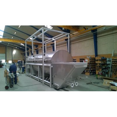 Cooker/blancher for Ø2000x6000 mm for meat and beans: Retention time 1 hr. Manufactured in AISI-304, 1.4301. Outer diameter: 2000 mm. Flights with holes to avoid blocking of beans. Lit and bottom are insulated with a stainless steel cap. Pitch: 2000 mm. All parts in contact with food are manufactured in 2B surface. The lid is supplied with an actuator system for moving up and down. Manufactured according to food standards.