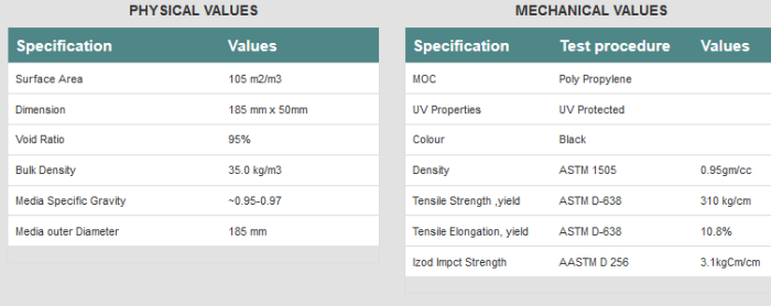 - Has large surface area with very high void ration of 95% enable to use media for wide wastewater treatment applications with varying organic loading.