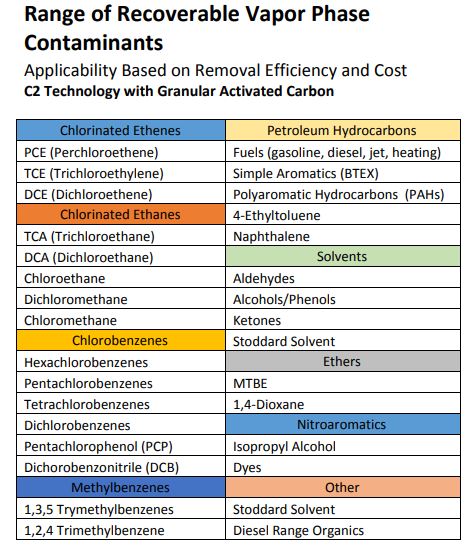Activated carbon vapor extraction and treatment systems enhanced with C2 Technology are typically used to remediate and control the following contaminants of concern: