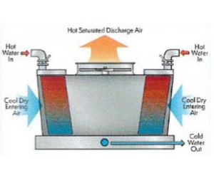 Warm water from the heat source is pumped to the water distribution system at the top of the tower. The water is distributed over the wet deck fill by means of large orifice nozzles. Simultaneously, air is drawn in through the air inlet louvers at the ends of the tower and travels horizontally through the wet deck fill across the water flow. A small portion of the water is evaporated which removes the heat from the remaining water. The warm moist air is drawn to the top of the cooling tower by the fan and discharged to the atmosphere. The cooled water drains to the basin at the bottom of the tower and is returned to the heat source.