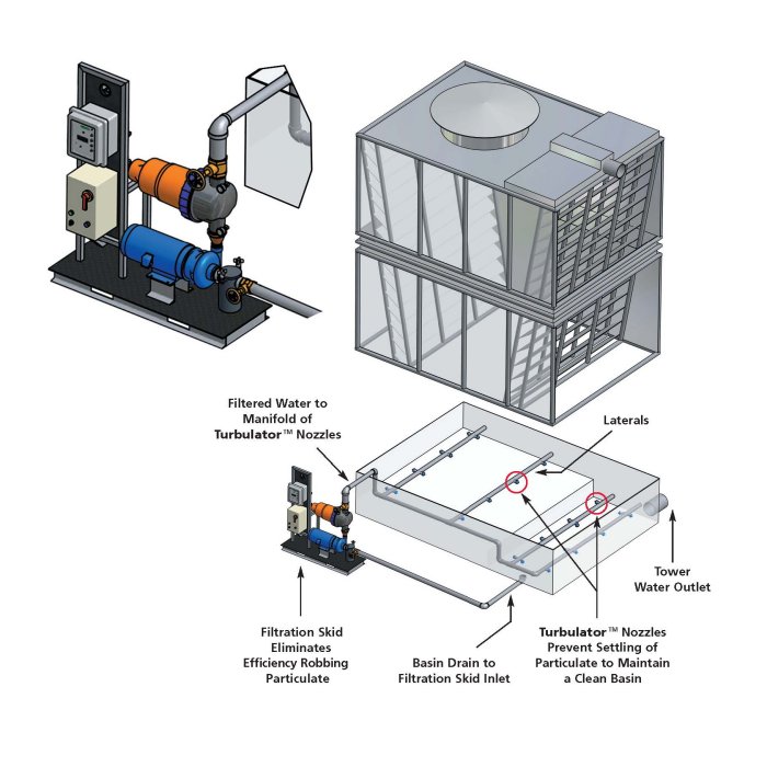 Keeping the cooling tower basin clean is another important aspect of cooling tower filtration. VAF offers a Cooling Tower Basin Agitation System composed of TurbulatorTM Eductor nozzles that agitate the basin water and keep solids in suspension to be removed by filtration.