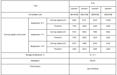 Remark: Below parameters are based on Refrigerant R404A, please contact us for more details if any other kinds of refrigerants used.