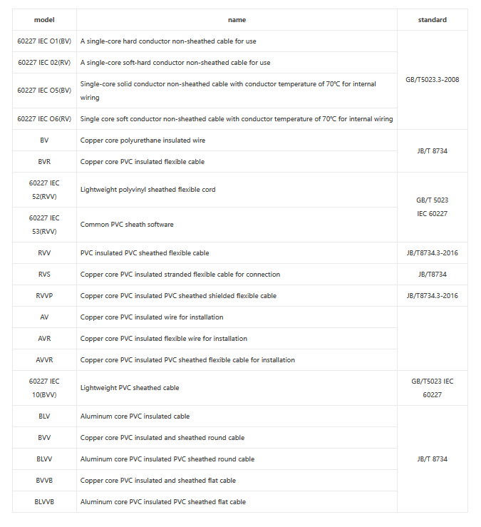 This product is produced in accordance with the standards of GB/T 5023-2008 "PVC insulated cables with rated voltages of 450/750V and below", JB/T 8734-2016 "PVC insulated cables, wires and cords with rated voltages of 450/750V and below" At the same time, it can also be produced in accordance with the International Electrotechnical Commission`s recommended standards IEC, British standards, German standards and American standards according to user needs.